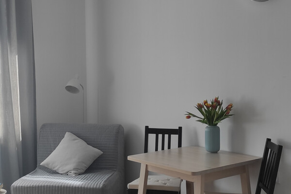 Łóżko (160cm), kanapa, stół z krzesłami, telewizor, szafa, deska do prasowania, suszarka na ubrania.
