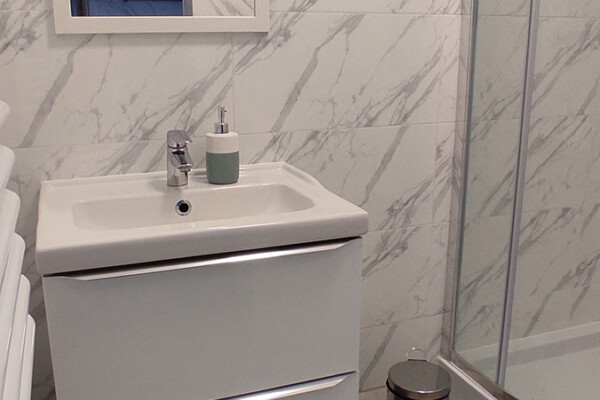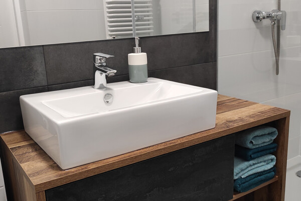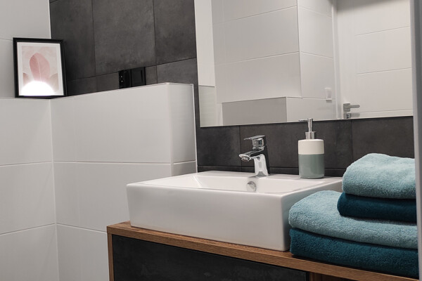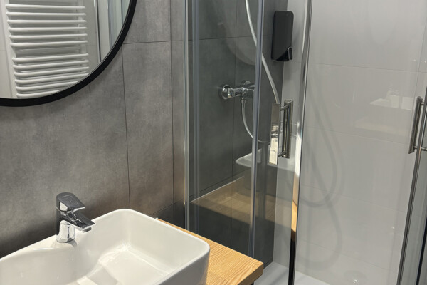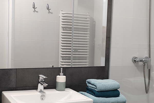 Łazienka wyposażona jest w prysznic, kosmetyki, ręczniki oraz suszarkę do włosów.