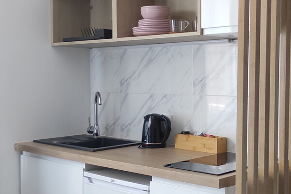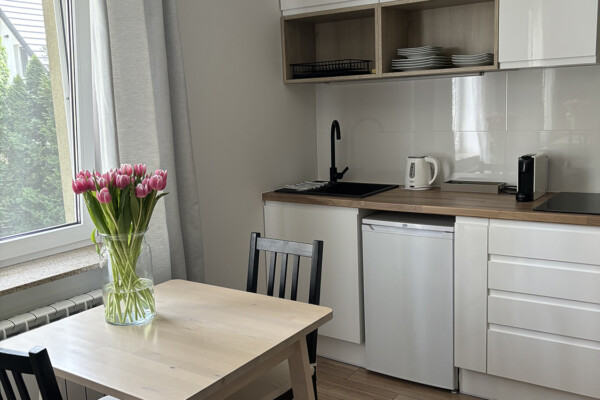 Aneks kuchenny: kuchenka indukcyjna, czajnik, lodówka, talerze, sztućce, garnki, patelnie, kubki, ekspres do kawy, kapsułki z kawą, herbata